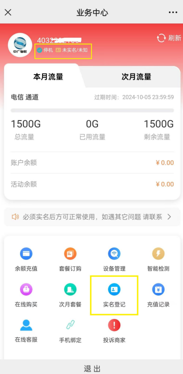 5、手机绑定确定后进入无线宽带“业务中心”页面,页面左上角图示处会显“停机与未实名提示”,选择页面下方“实名登记”选项,进行实名认证。