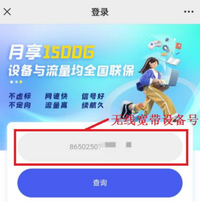 3、选择“扫码关注充值”选项,进入“登录”页面,输入设备号,点击“查询”。