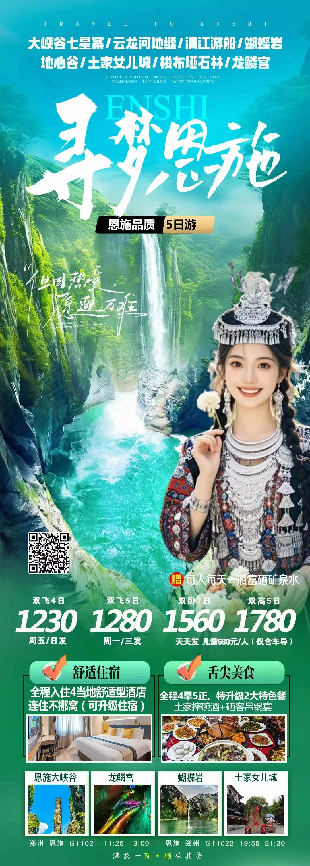 【寻梦恩施】郑州->恩施,航班特价双飞游,每位4日(1230元)周五、日发团/5日(1280元)周一、三发团,火车双卧7日1560元/高铁1780元天天发