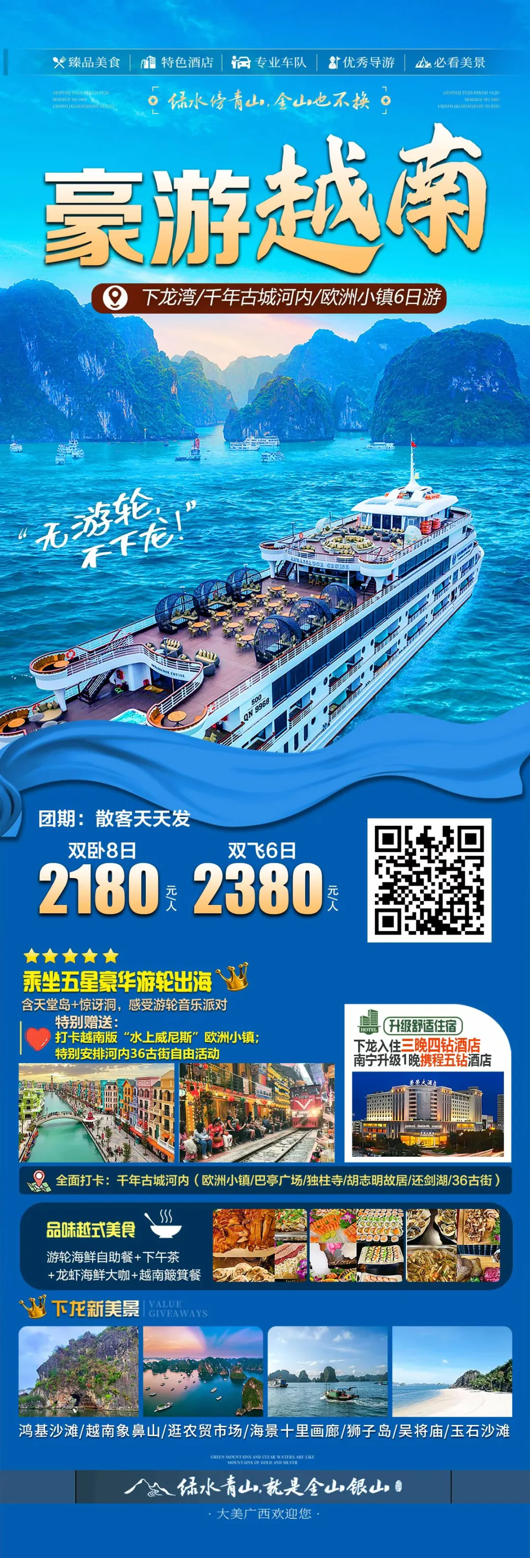 【豪游越南】越南下龙欧洲小镇河内双飞6日游,郑州起止,天天发团,2380元每位