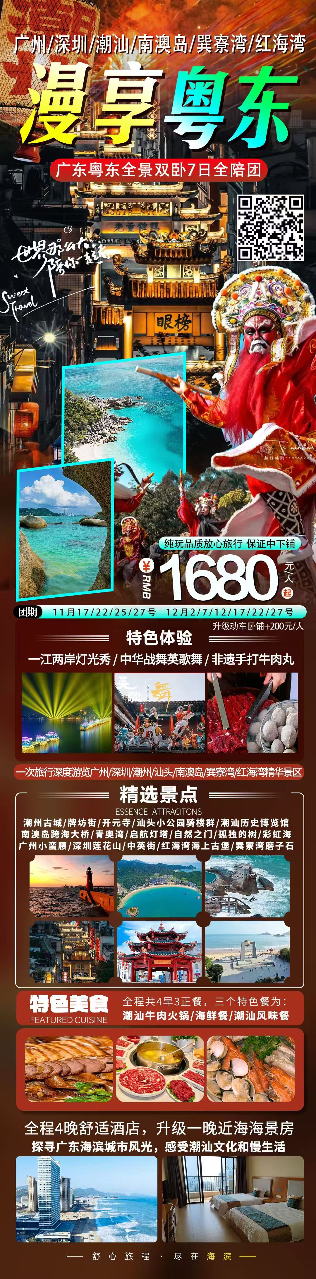 【漫享粤东】广东粤东全景双卧7日游纯玩全陪团,郑州起止,1680元每位,团期:2025年11月17、22、25、27日,12月2、7、12、17、22、27日;广州+深圳➕潮州➕汕头➕南澳岛➕惠州巽寮湾➕汕尾红海湾