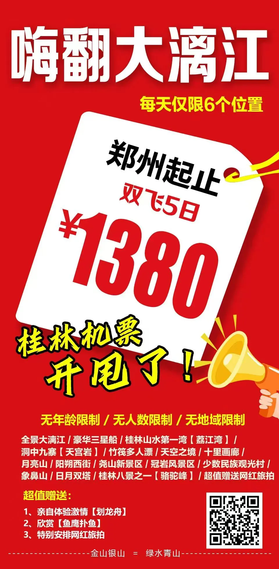 特价【嗨翻大漓江】郑州起止->广西桂林双飞5日游,每位1380元,团位请现询